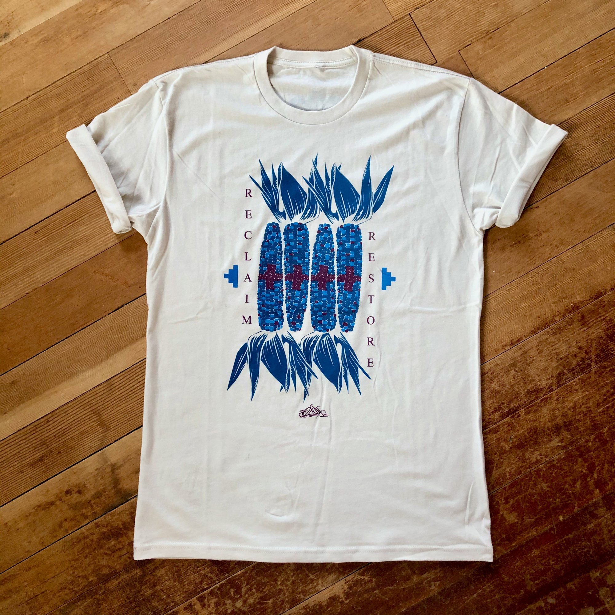 The artist explains the design: "My grandparents took care of a few acres of corn fields and squash fields in a hand built cabin near Shonto on the Navajo Rez. My family would walk the rows of corn, pick the fully grown ones, and toss them in the back of my dad's truck. We'd fill his truck bed multiple times easily and go through the processes of steaming corn through the mud oven we built, or roasting corn over a fire, or grinding corn to make kneel down bread. This process showed me the pride my grandparents had in maintaining their land for us all to feed ourselves.It was a selfless act, they even allowed neighboring houses to drive their trucks and fill their truck beds at no cost. I could tell they enjoyed our help, and were proud we were interested in learning and spending time with them. Food is what brought us together and what taught us hard work. We were independent by growing food that loved us back, nothing packed with sugar or preservatives that looks to endanger our health. Through this design I've shown blue corn at harvest season and included the words "RECLAIM" and "RESTORE" to show the strength of food sovereignty."