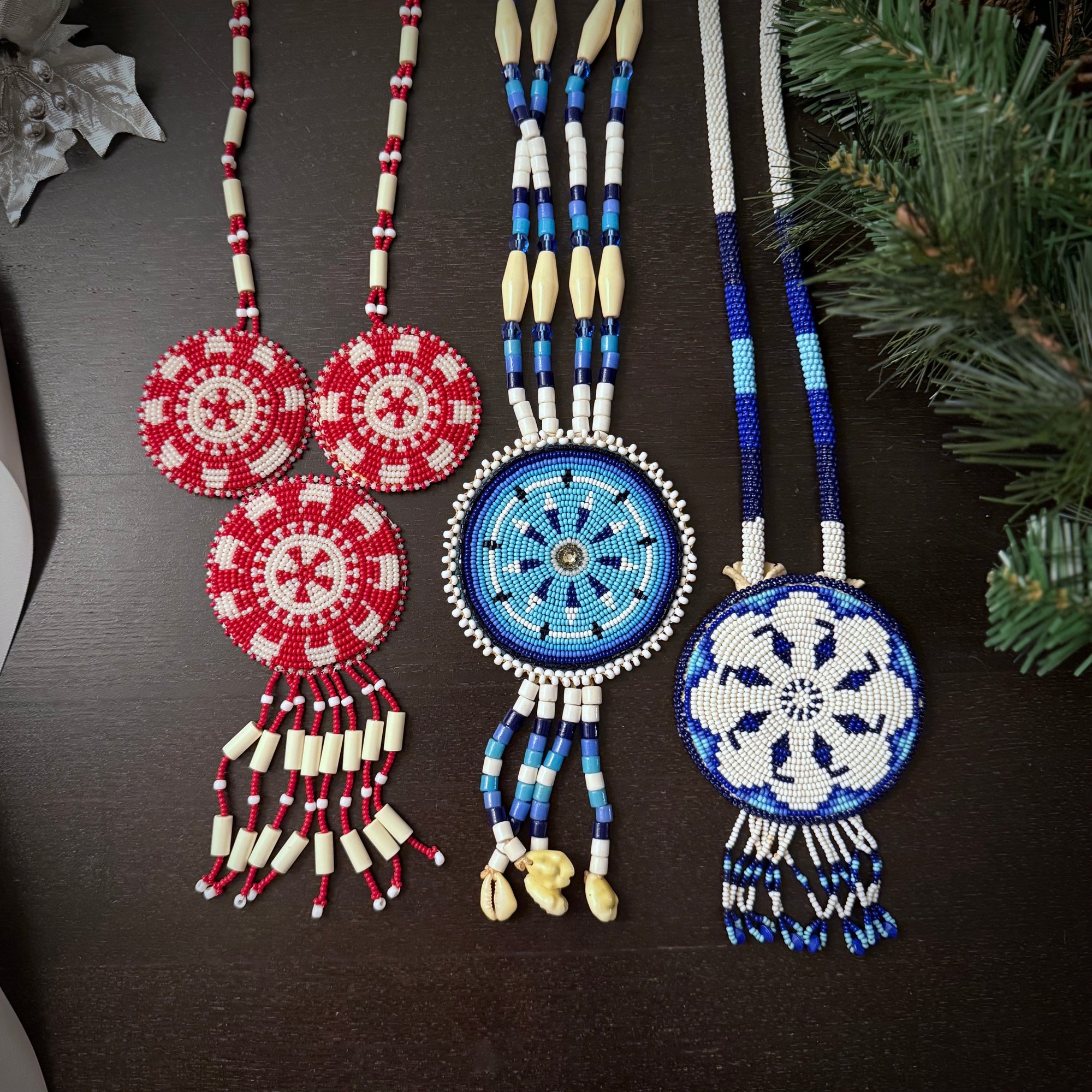 The medallion measures 3.25" wide with an intricate edging and 1.5" looped fringe. Backed with hide. The beaded necklace measures 30" to easily slip over the head for wear. One of a kind. Whether this is a gift for yourself or for someone special in your life, the medallion comes packaged in a BBB jewelry box with ribbon.