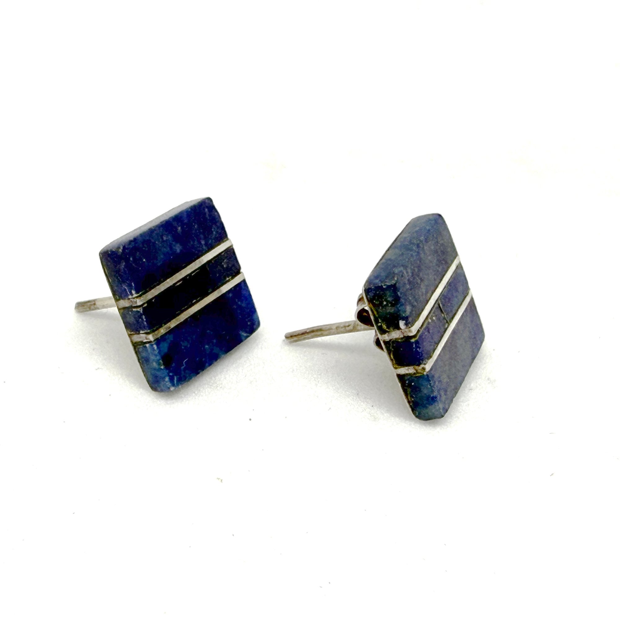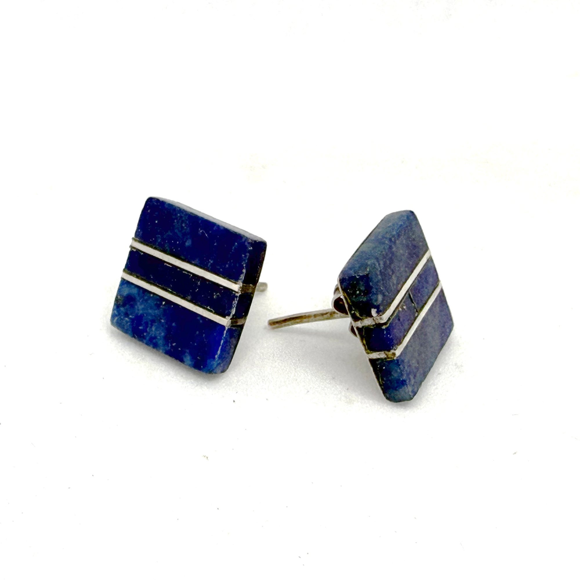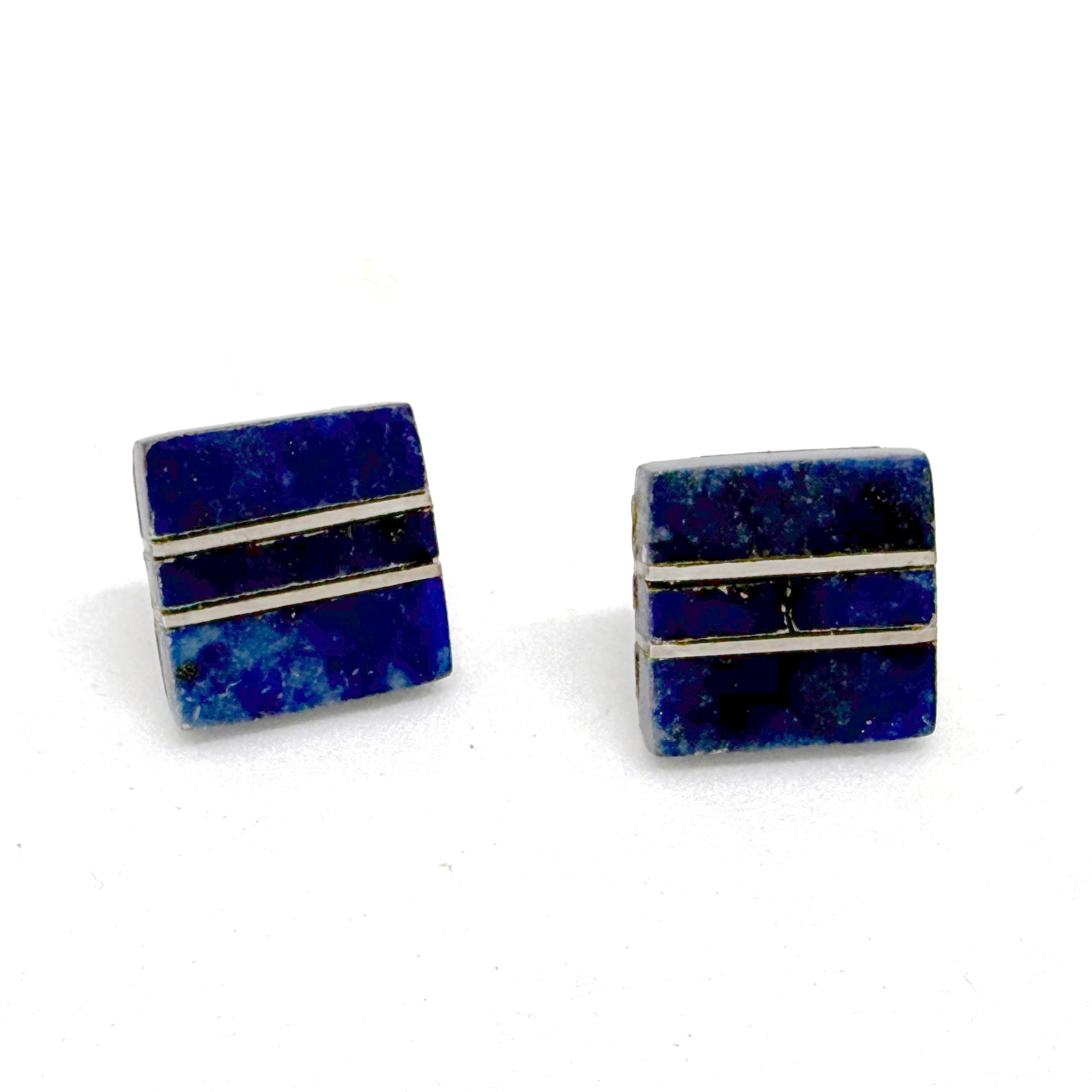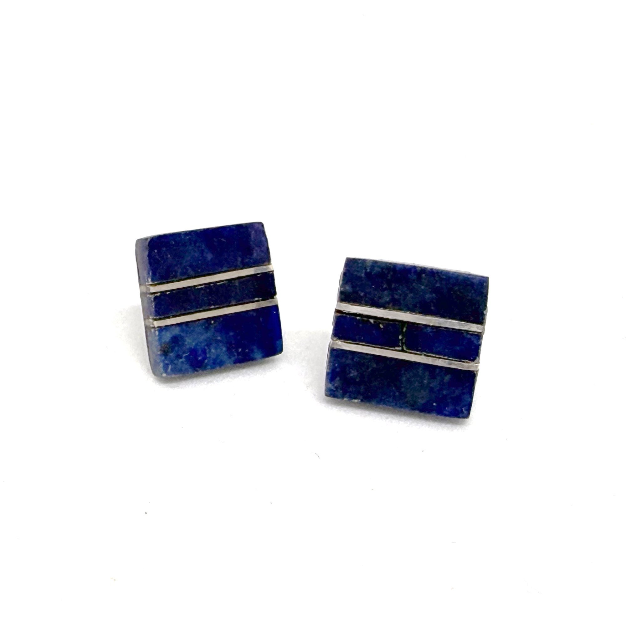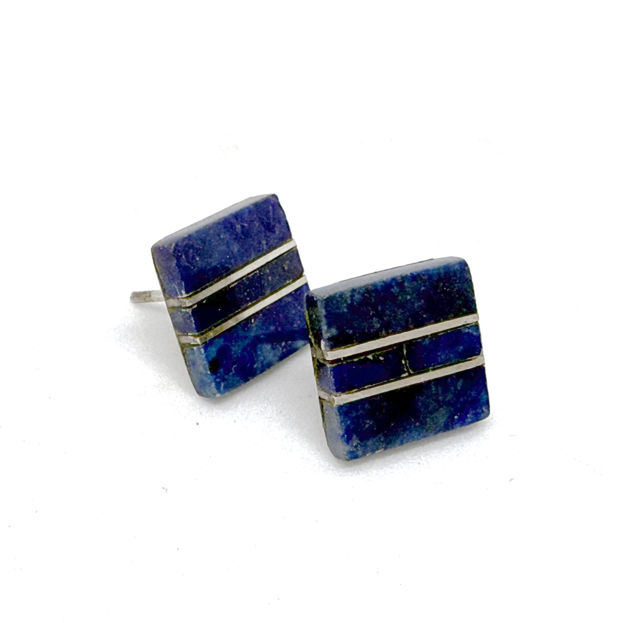 These small handmade post earrings feature dark blue lapis set in sterling silver blocks. The earrings measure .5" wide.