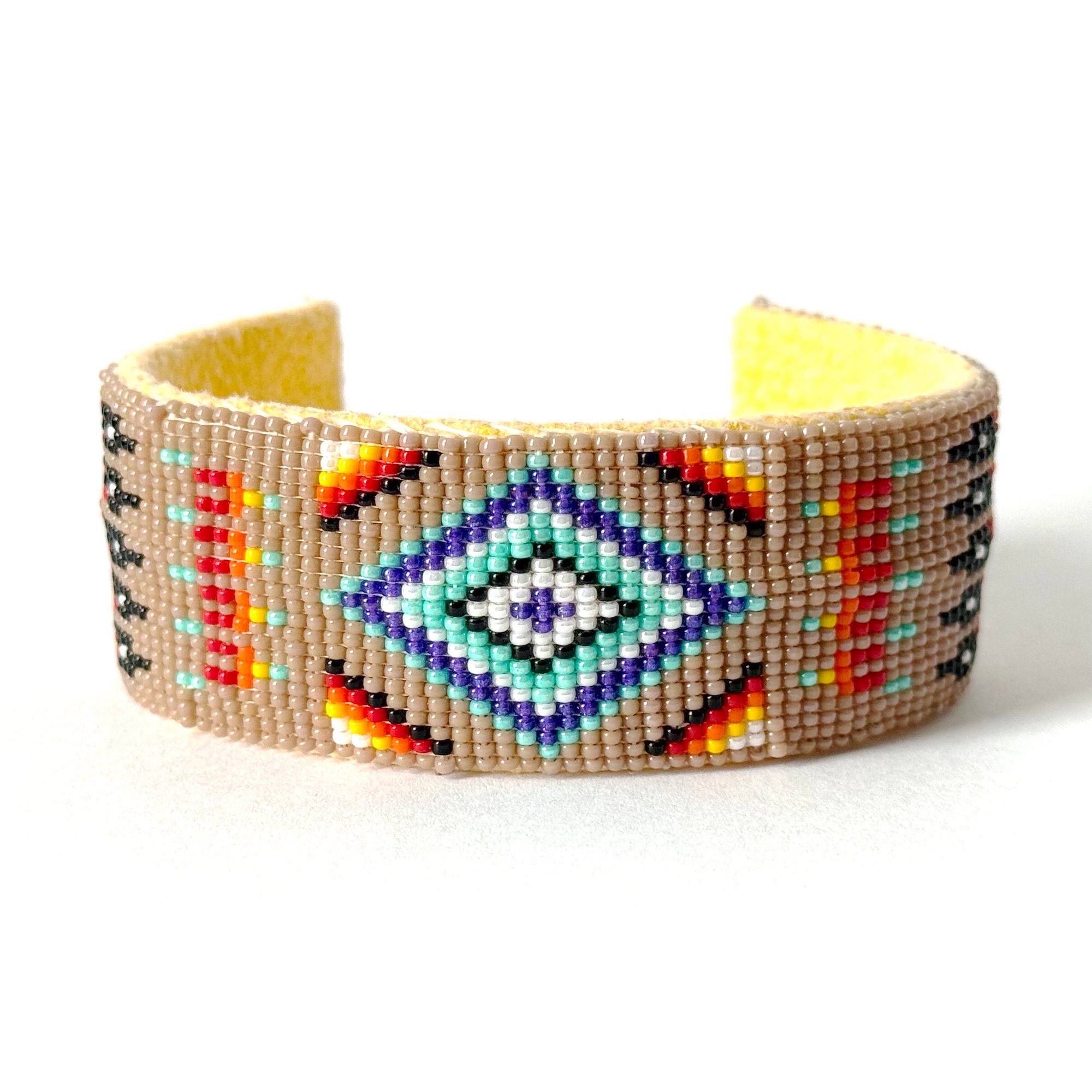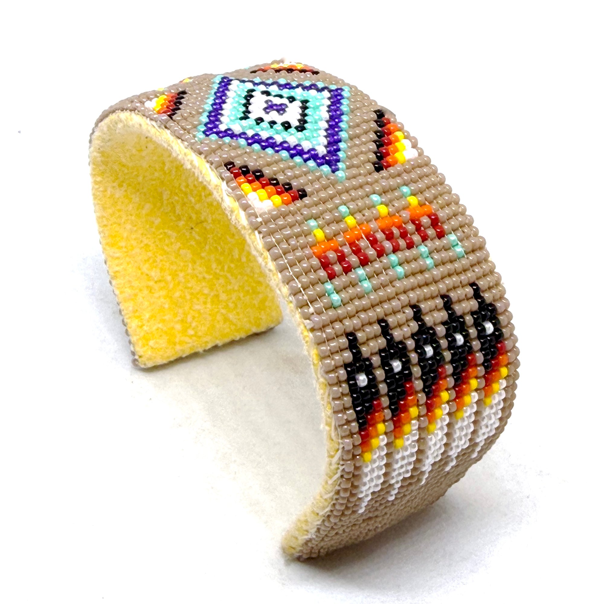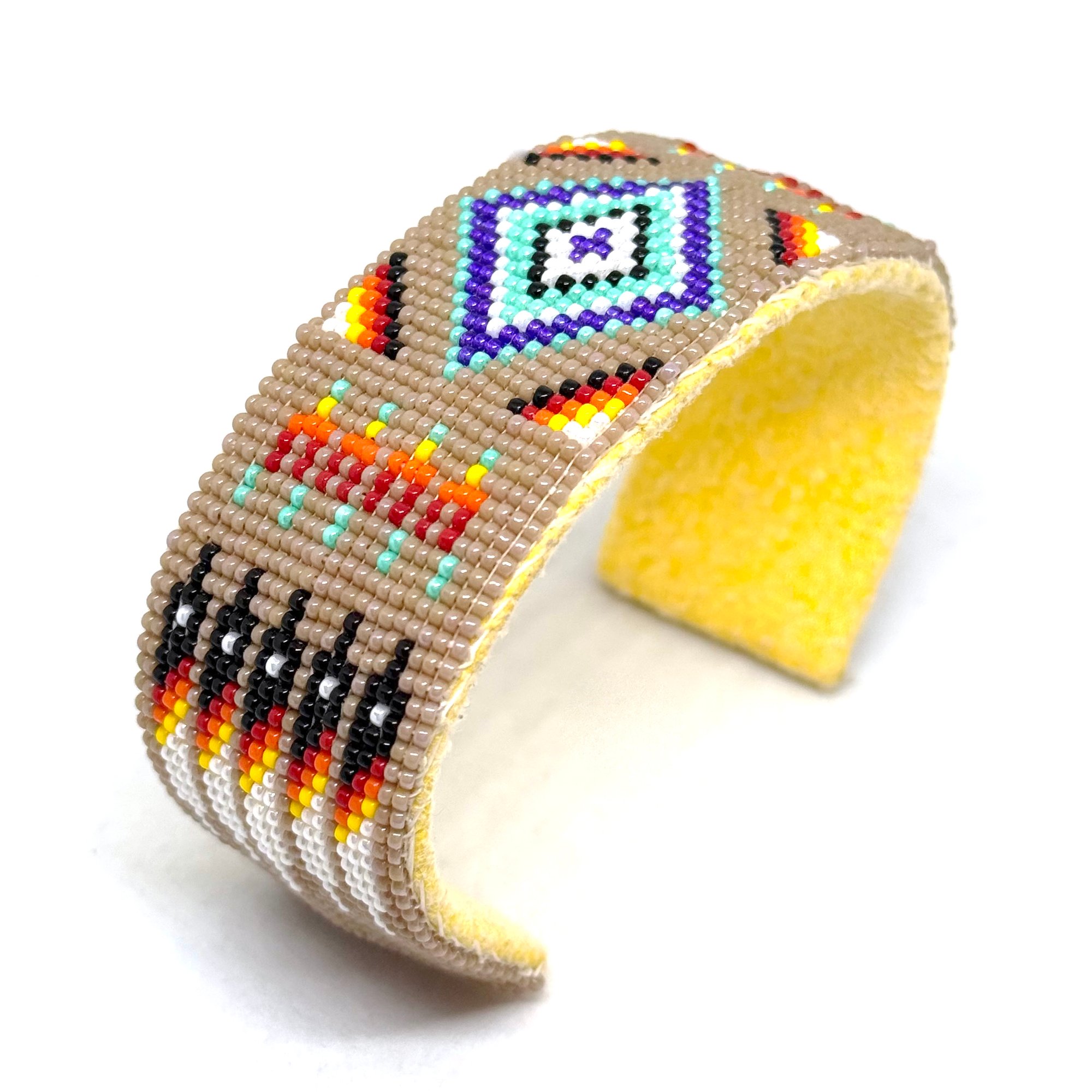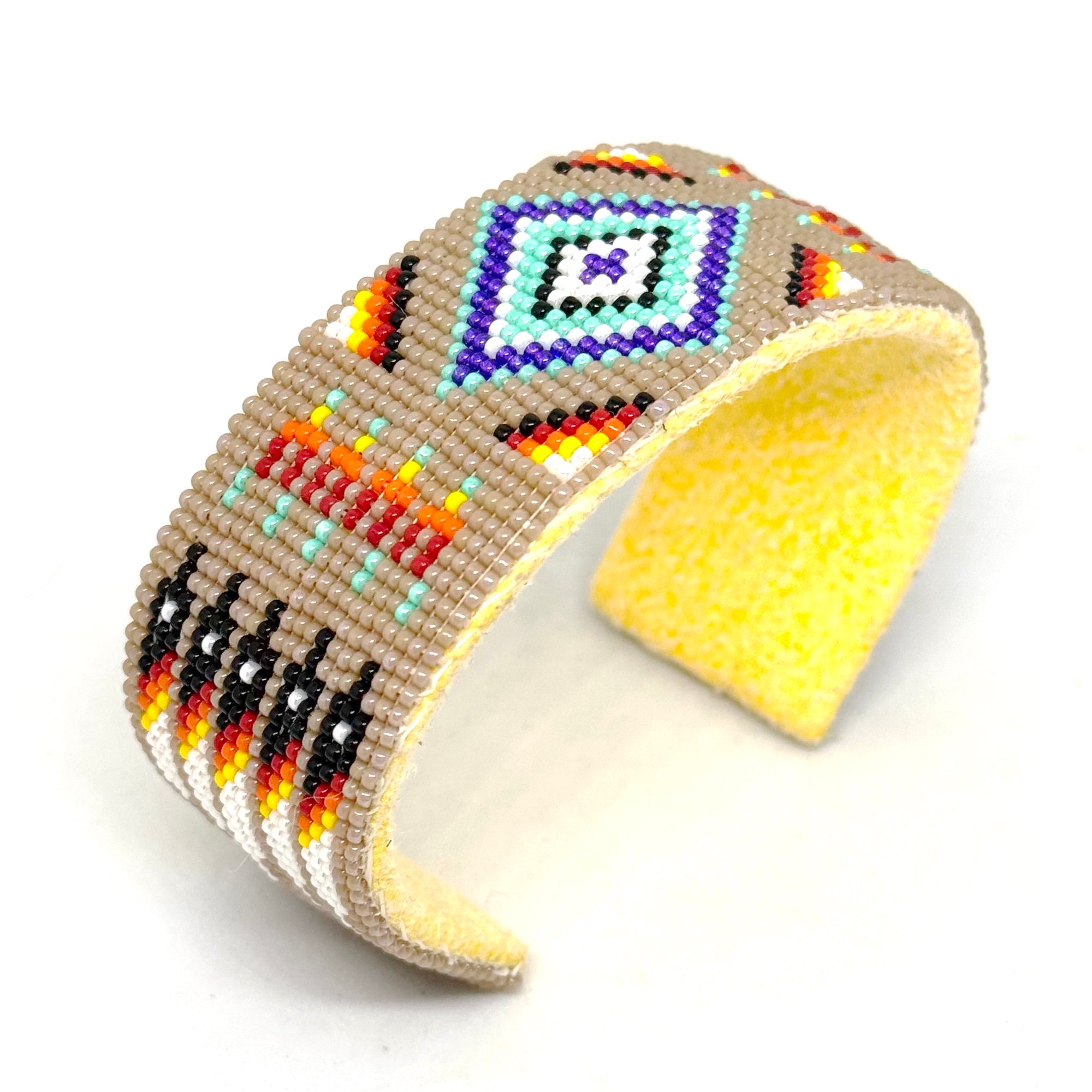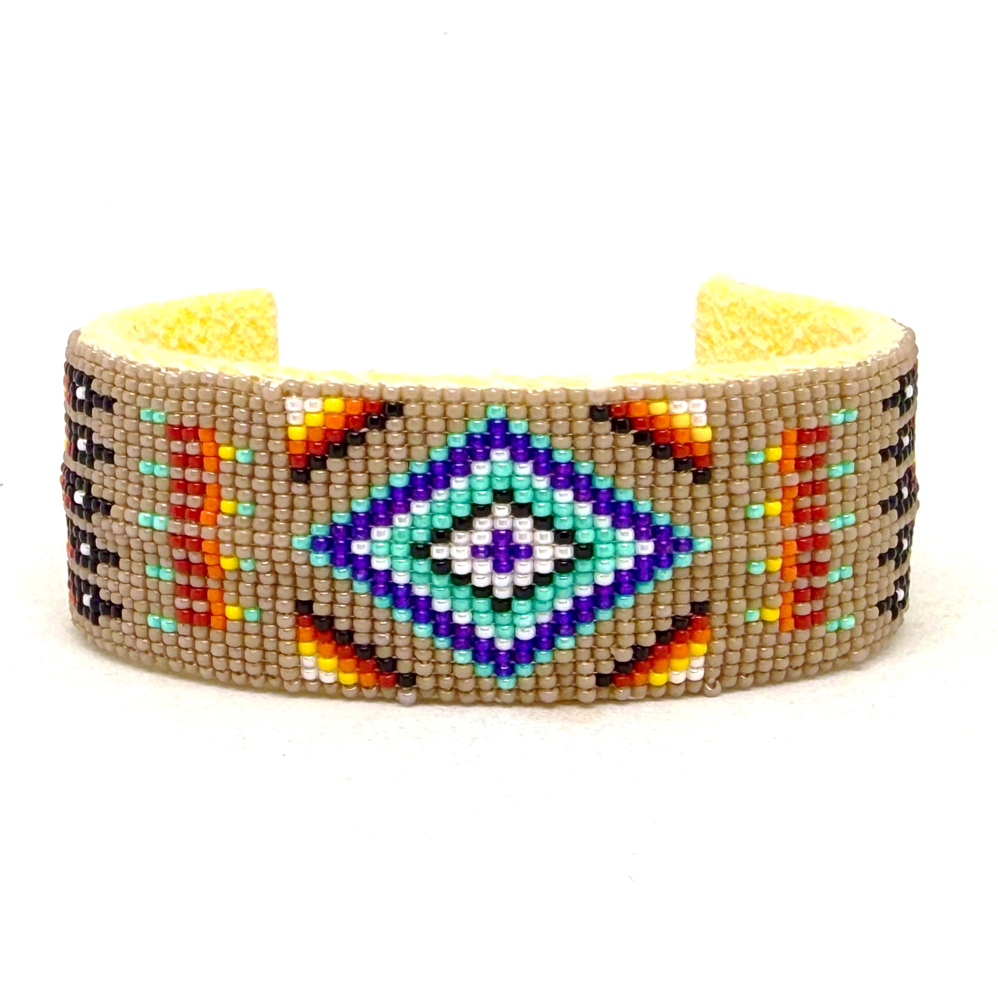 This large handmade beaded Navajo cuff features tiny size 15 seed beads in rich colors with a central geometric design radiating outward. With a thick copper metal core, the bracelet is adjustable to fit most wrists and is backed with soft tan hide.