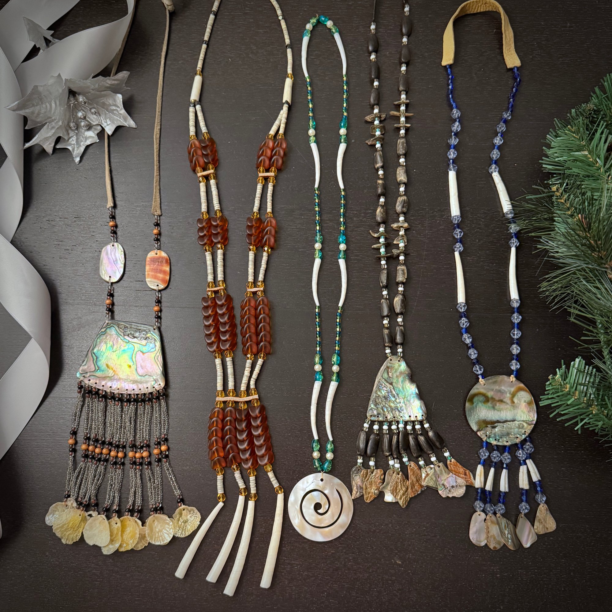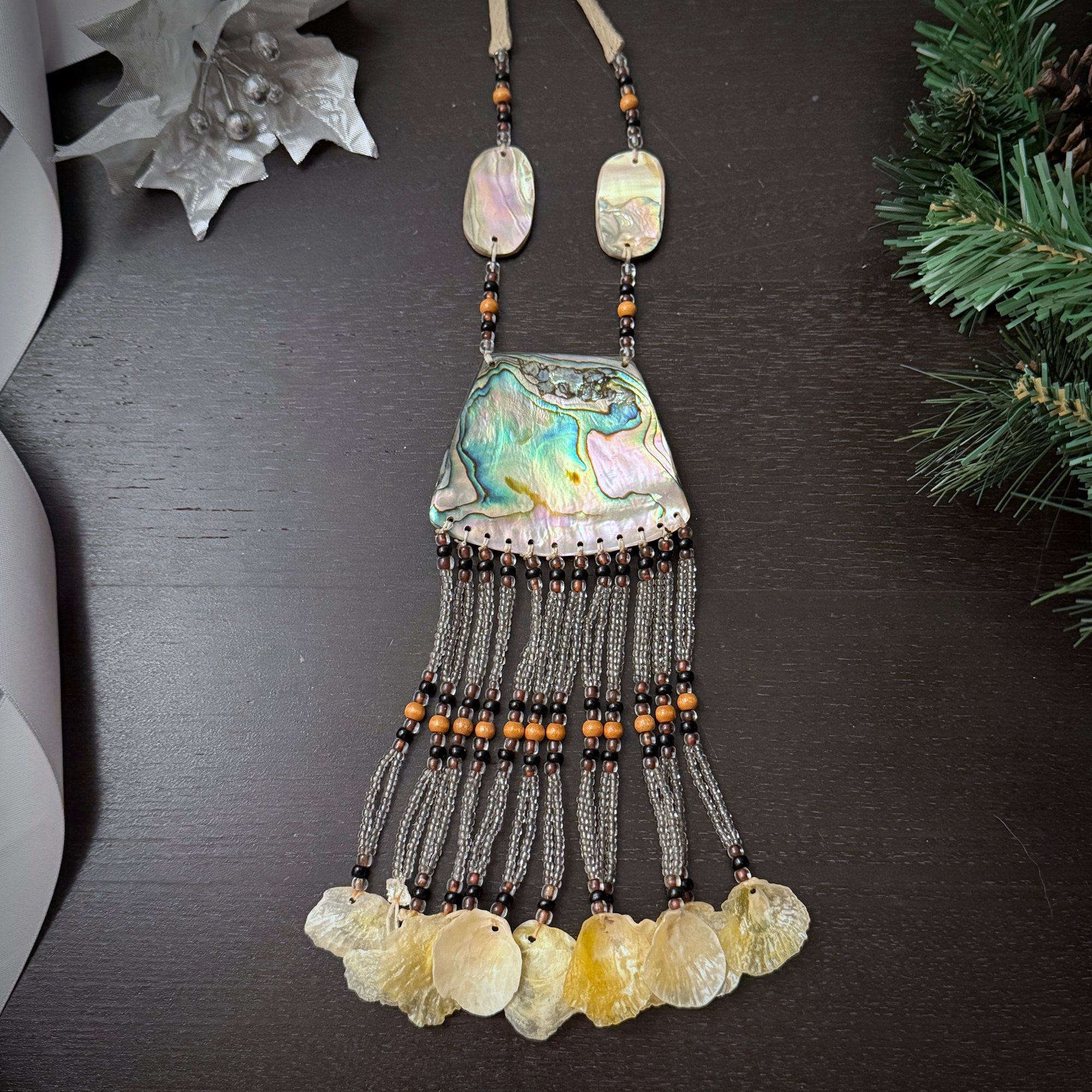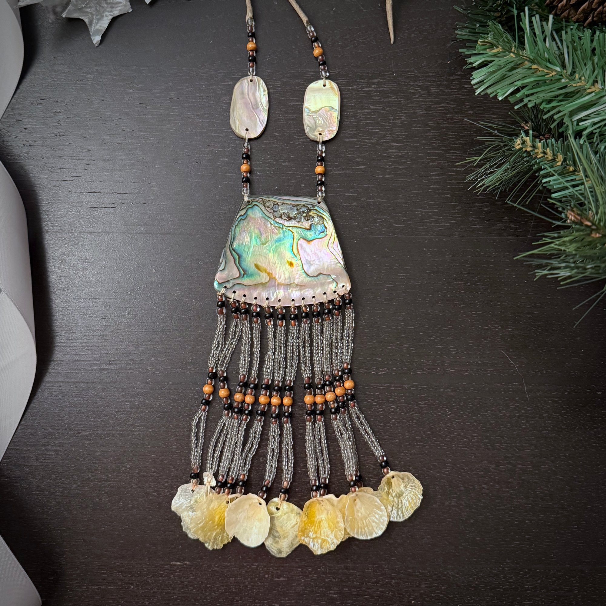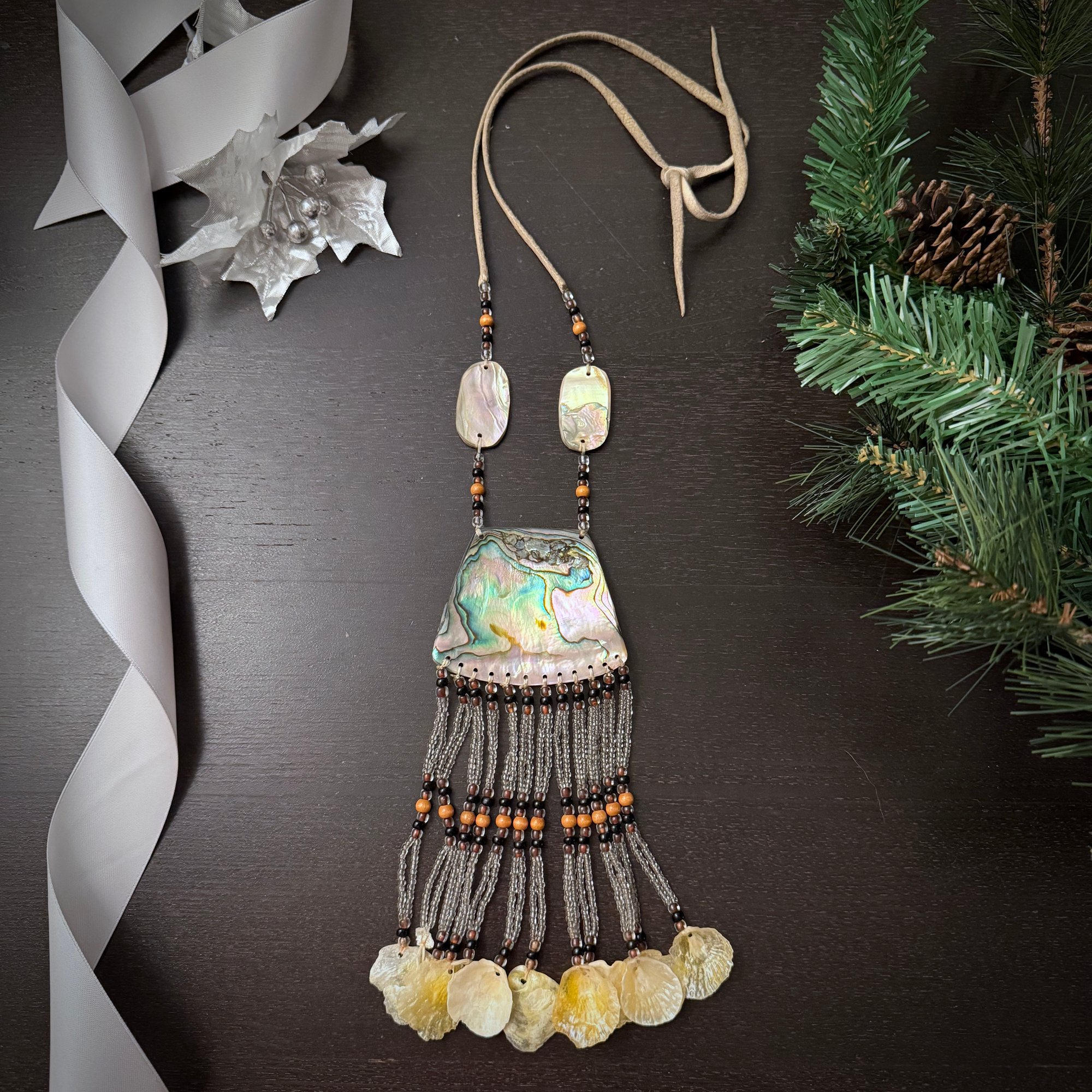 This large statement necklace features a trapezoidal thick abalone shell pendant, accented with 4.5" long fringes of translucent glass beads, small black trade beads, wooden sphere beads, and translucent sea shells. The top necklace also has two 1.5" long polished red abalone shells. The large 2.5” pendant hangs on an adjustable tie necklace measuring 24” to easily slip over the head for wear.