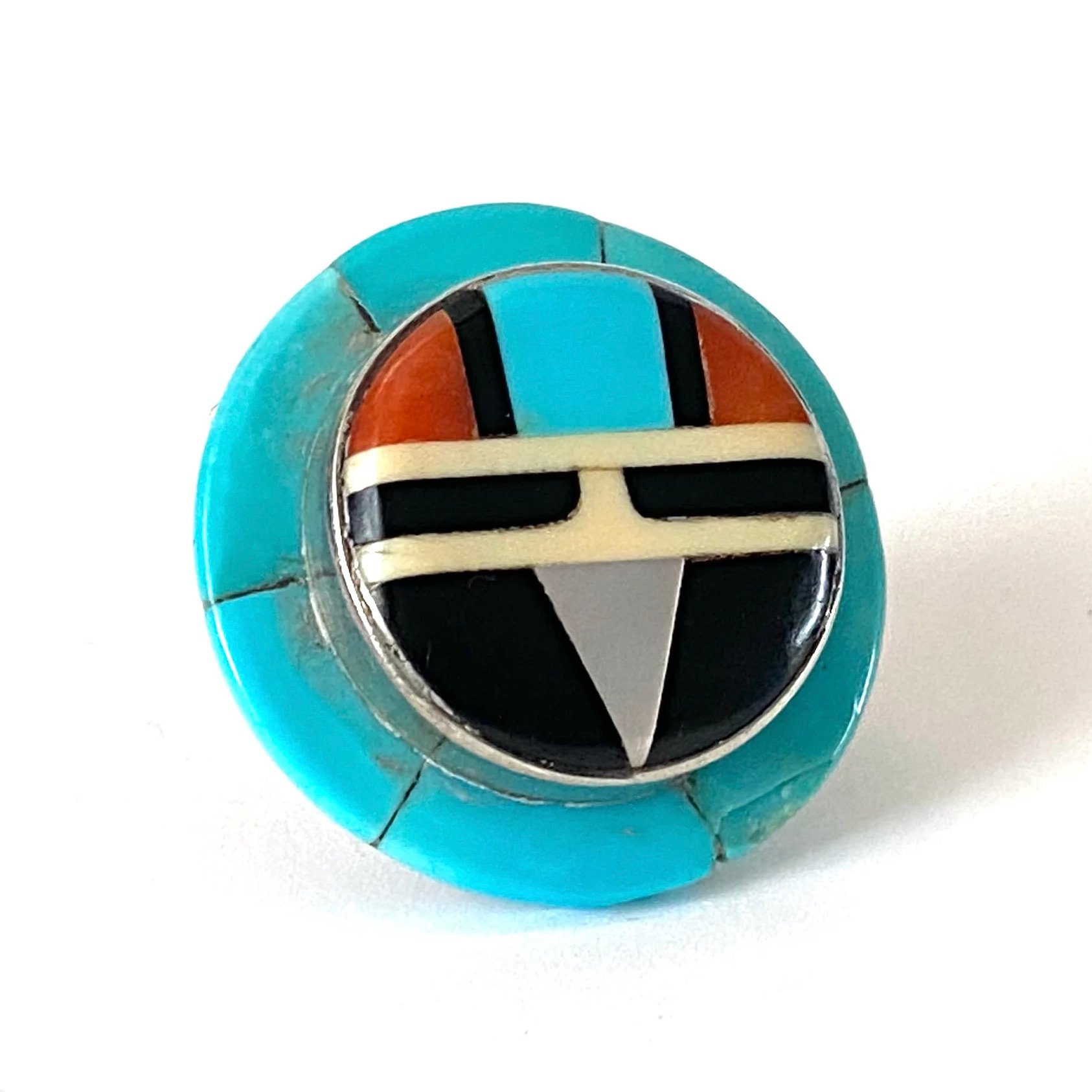 Add a touch of slick modern culture to your day with this extraordinary vintage Zuni ring. It features rich turquoise, bright red coral, black onyx, and shimmering shell. The pieces are meticulously and expertly combined to create the recognizable Zuni Sunface symbol.