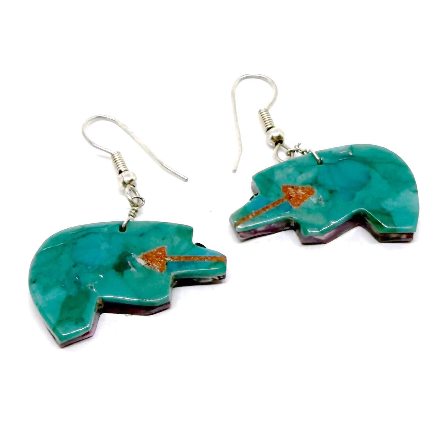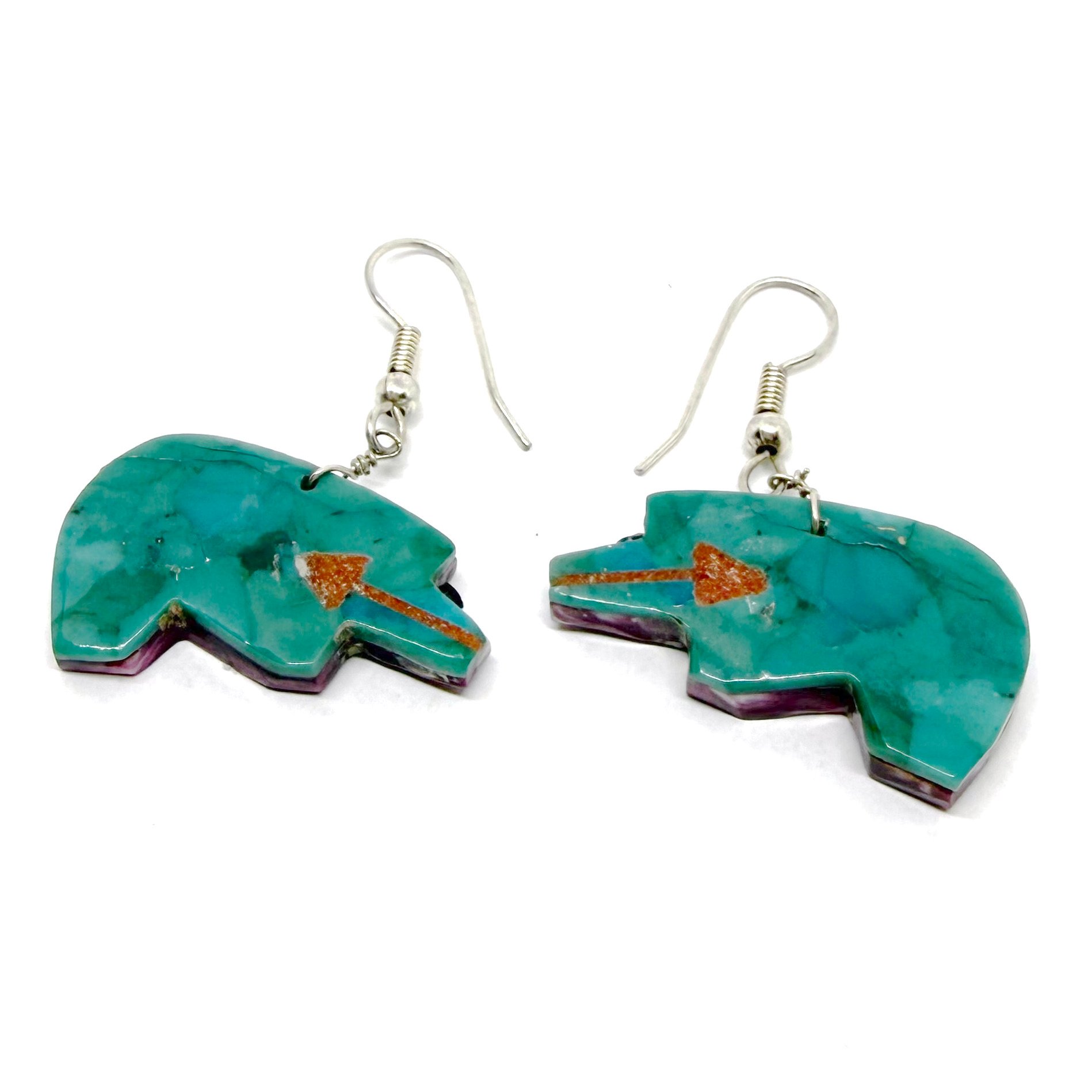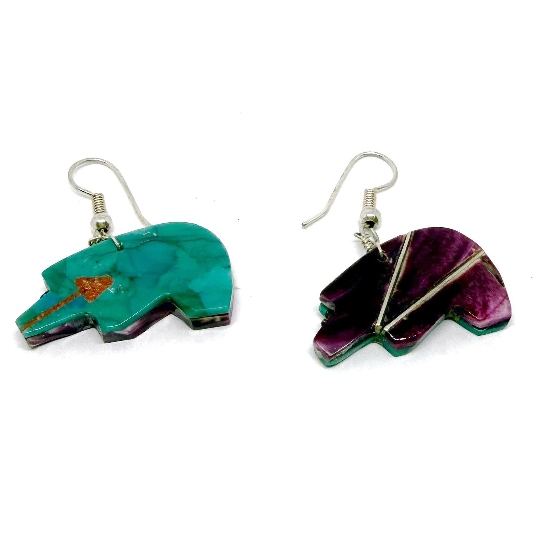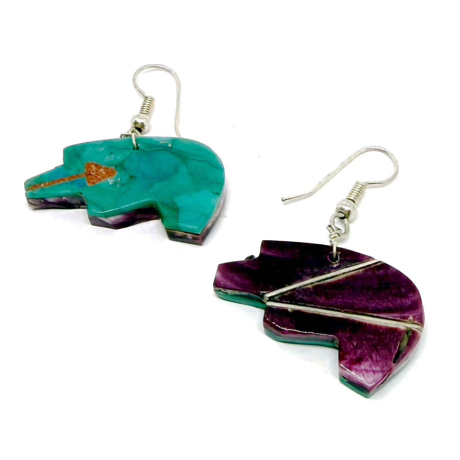 Wow! These earrings are so cool. The double-sided vintage Santo Domingo Pueblo earrings feature a bear silhouette intricately carved from purple spiny oyster shell and turquoise, with a subtle tan coral heart line. The earrings hang 1.5" long. They naturally move when worn, casually showing off both sides, which will definitely garner many compliments!